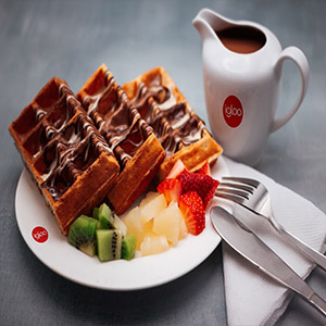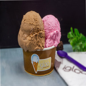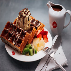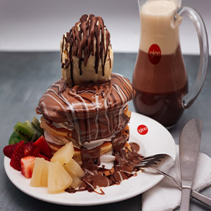 بان كيك محشية بكريم باتيسيار و فواكه وتقدم مع كوب من الشوكولا البلجيكيةالمميزة من اختياركم وبولة من الايسكريم من اختياركم