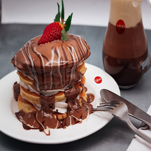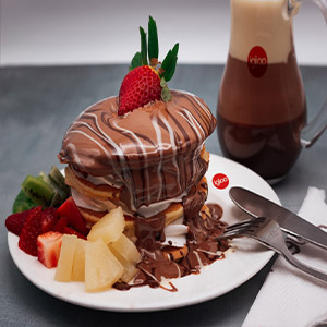 بان كيك محشية بكريم باتيسيار و فواكه وتقدم مع كوب من الشوكولا البلجيكيةالمميزة من اختياركم