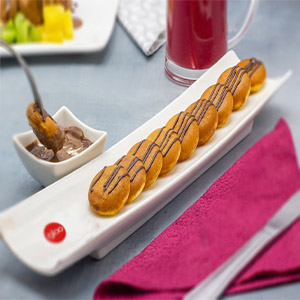 قطع من البانكيك محشية بكريم باتيسيار و مغطسة بثلاث انواع من الشوكولة البلجيكية