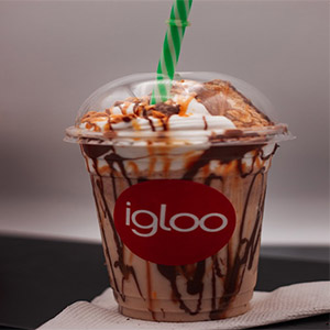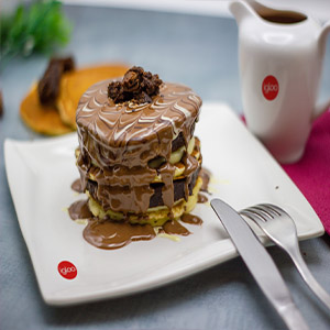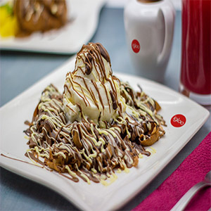 بان كيك محشية بكريم باتيسيار و فواكه وتقدم مع كوب من الشوكولا البلجيكيةالمميزة من اختياركم وبولة من الايسكريم من اختياركم