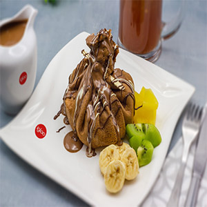 بان كيك محشية بكريم باتيسيار و فواكه وتقدم مع كوب من الشوكولا البلجيكيةالمميزة من اختياركم